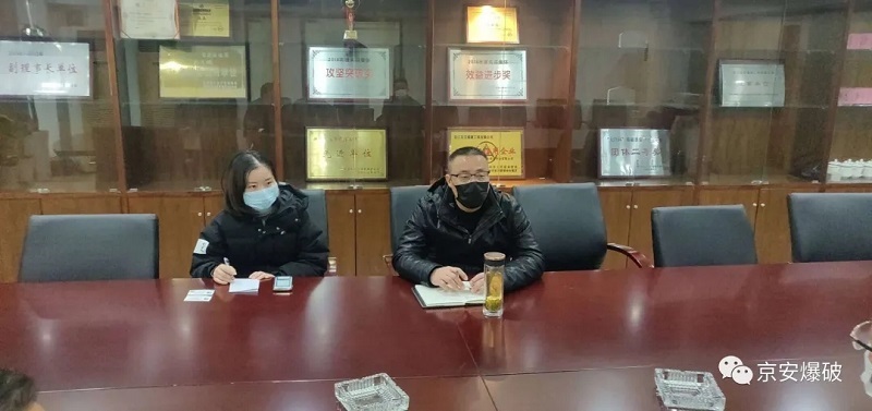 拱墅区财政局工作组实地了解了公司防疫和复工复产情况,在听取公司领导汇报后,现场作了政策解答,并对公司所采取的防控措施表示赞赏。工作组认为,京安爆破公司作为国有企业,在疫情防控期间,切实履行了国有企业主体责任,并在企业停产期如数发放职工薪资,充分展现了负责任的企业形象,针对疫情期间给公司所造成的困难和问题,作为财政对口管理部门,工作组成员详细解读了疫情期间中央、省、市、区有关财政帮扶优惠政策,助力公司渡过疫情难关,同时表示愿意在外籍员工返工包车、防疫物资筹备等方面提供相应帮助。