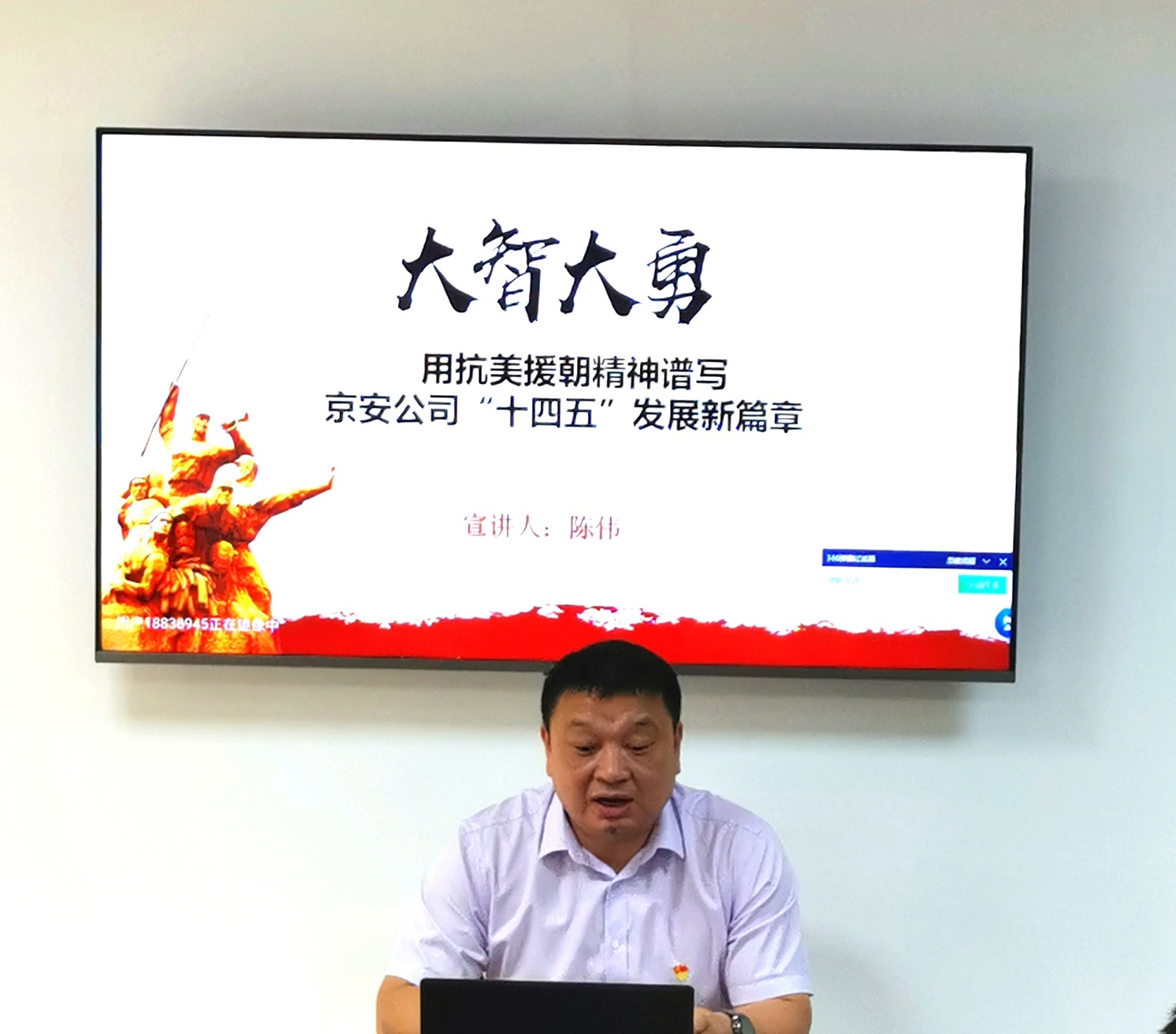 陈伟同志在题为《大智大勇 用抗美援朝精神谱写京安公司“十四五”发展新篇章》的党课中,回顾了上世纪50年代中国人民志愿军在客观条件十分艰苦的情况下,不畏强敌、藐视困难,大智大勇,夺取胜利的伟大历史。提出“大智大勇、敢于胜利”不仅是志愿军的军魂,同样也应该是京安的企业之魂,要用这种精气神去克服前进中的困难挑战,奋力完成年度重点工作。