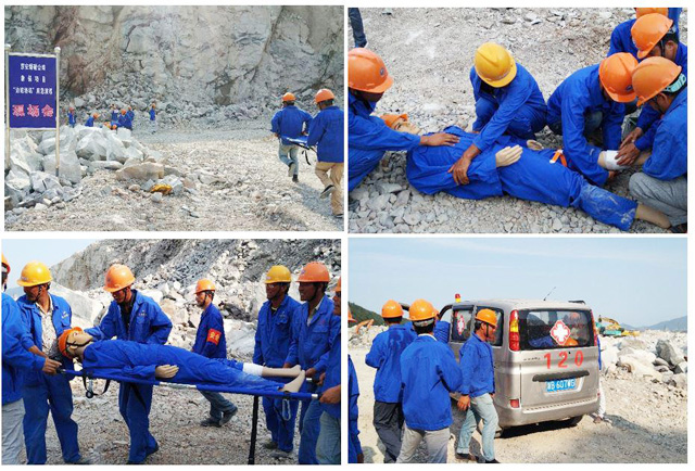 为了使演练更加贴近实战,能够直观演示救援环节,项目部在+20平台模拟设计了边坡局部坍塌,现场安全员发现一名施工人员(假人)被掩埋,警报骤响,项目部立即启动事故应急救援预案,迅速组织力量自救,同时向业主和地方政府报告事故情况,并联系医院实施救援。在救援总指挥的指挥下,各救援小组火速集结,分工明确、行动有序;安全保卫组立即封锁道路和事故区域,设置警戒线,疏导交通;技术保障组立即进入事故现场查看险情,对边坡塌方区域进行监控、分析和观测;后勤保障组立即组织救援设备、物资奔赴现场;医疗救护组携带医疗救护设备随时待命,准备救治伤员;抢险救援组火速进入事故现场开展救援,组织挖机、装载机清理边缘土石方,再进行人工清渣,被困伤员被成功救出;待命已久的医疗救护组对立即伤员进行必要的止血、包扎、固定等处理后,立即将伤员抬上担架,送上“救护车”,前往“医院”接受救治。整个救援过程衔接紧密,为抢救伤员赢得了宝贵时间。
